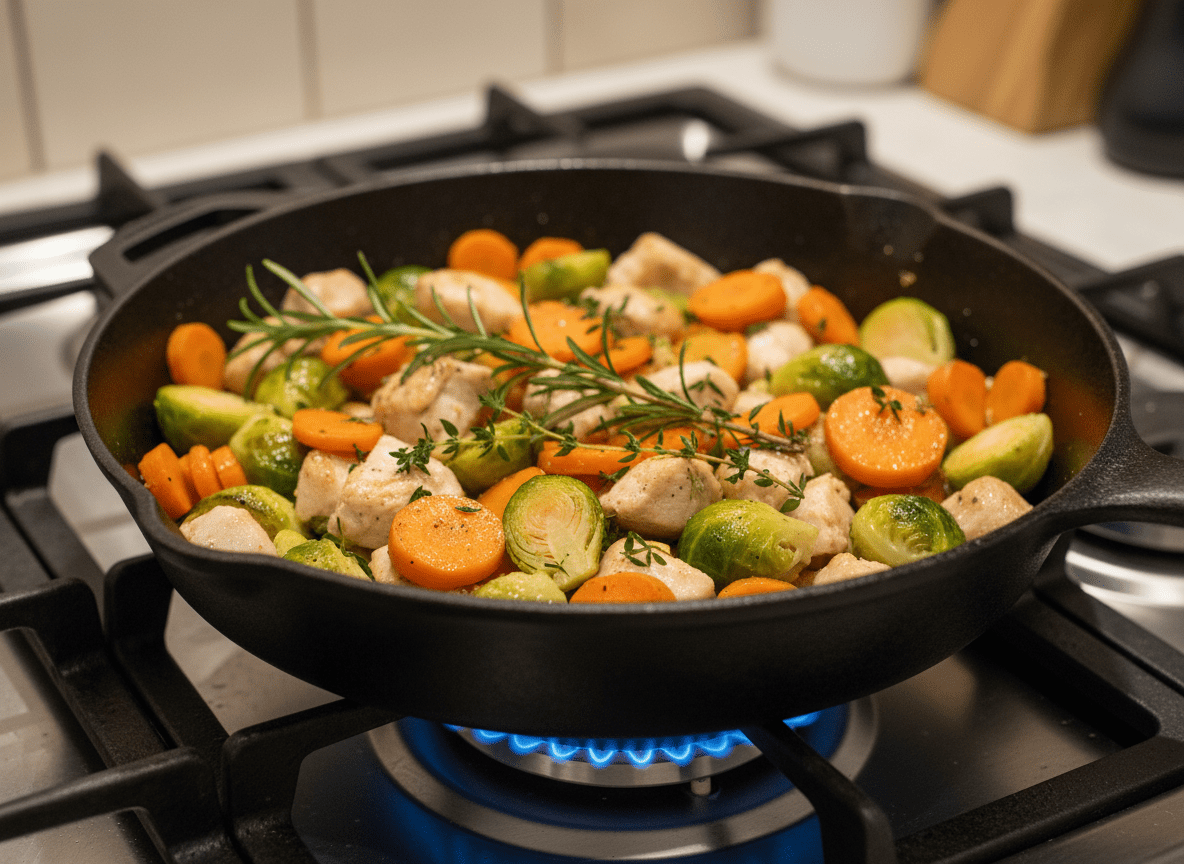 Sa poêlée d’automne au poulet, potimarron et choux de Bruxelles, c’est tout ce qu’on aime :